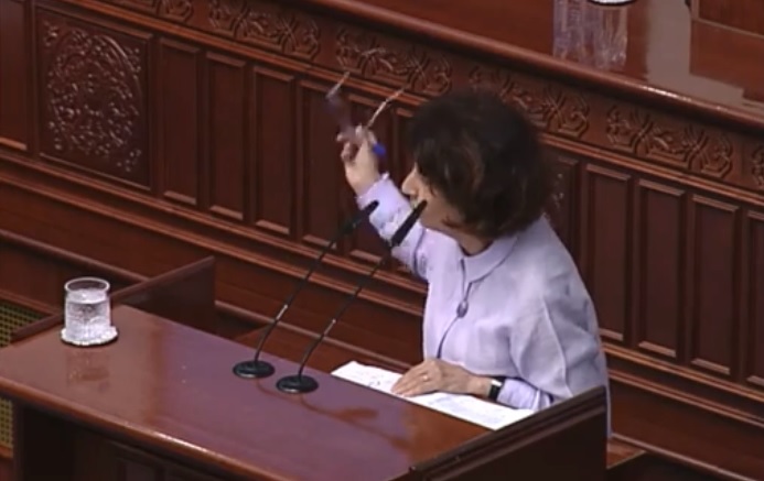 „Прашањето е од кого ни извира легитимитетот за уставните измени, од граѓаните или од Европската Унија? Од каде го добивте легитимитетот? Да ве потсетам дека суверенитетот им припаѓа на граѓаните. Не треба ли да ги прашаме дали се за ваква измена? Вие, господа, гости од Владата, ги прифативте уставните измени и се согласивте да влезете во преговарачката рамка преку протоколот, ама заборавивте дека не сте законодавен орган и не можете законодавни обврски да преземете“, додаде таа.
